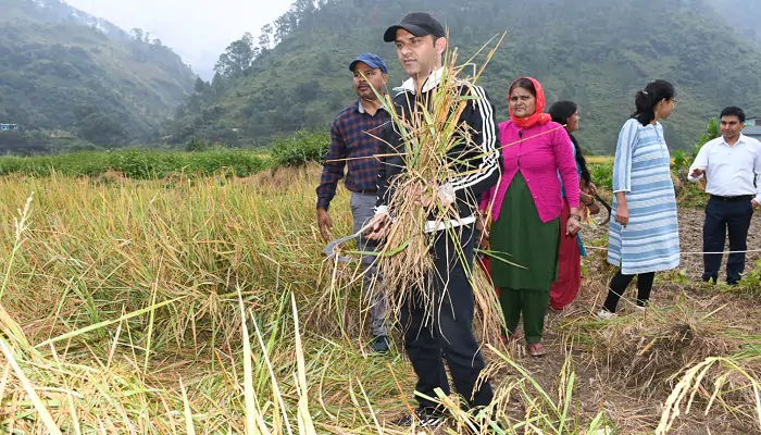 धान की फसल काटने खेत में पहुंचे जिलाधिकारी आशीष