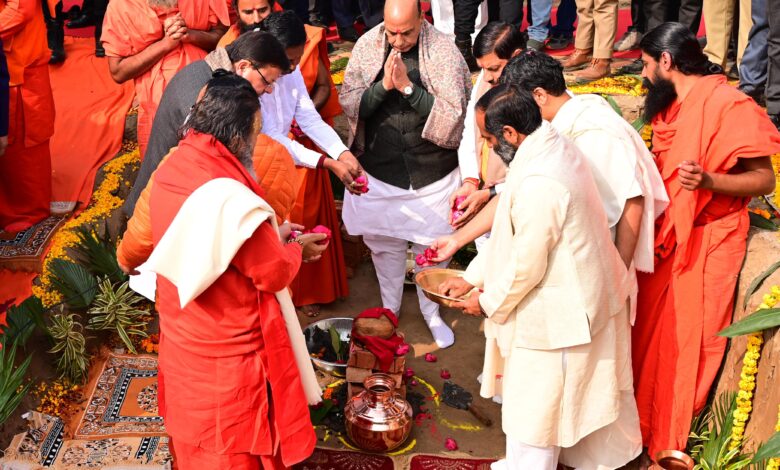 केंद्रीय रक्षा मंत्री, श्री राजनाथ सिंह ने शनिवार को स्वामी दर्शनानन्द गुरूकुल महाविद्यालय, हरिद्वार में मुख्यमंत्री श्री पुष्कर सिंह धामी, मध्य प्रदेश के मुख्यमंत्री डॉ. मोहन यादव, केन्द्रीय कानून मंत्री श्री अर्जुन राम मेघवाल एवं योग गुरु स्वामी रामदेव की उपस्थित में ’पतंजलि गुरूकुलम’ एवं ’आचार्यकुलम’ का भूमि पूजन कर शिलान्यास किया।