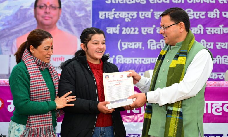मुख्यमंत्री पुष्कर सिंह धामी ने राष्ट्रीय बालिका दिवस के अवसर पर मुख्यमंत्री आवास स्थित मुख्य सेवक सदन में ‘मेधावी बालिका शिक्षा प्रोत्साहन’ कार्यक्रम के तहत मेधावी बालिकाओं को सम्मानित किया। जनपद स्तर पर इंटरमीडिएट और हाईस्कूल में प्रत्येक जनपद से प्रथम तीन स्थान प्राप्त करने वाली बालिकाओं और विकासखण्ड स्तर पर प्रथम स्थान प्राप्त करने वाली बालिकाओं को प्रशस्ति पत्र और स्मार्ट फोन देकर पुरस्कृत किया गया। राष्ट्रीय बालिका दिवस पर वर्ष 2022 और 2023 की टॉपर 318 बालिकाओं को पुरस्कृत किया गया। मुख्यमंत्री ने इस अवसर पर महिला सशक्तिकरण एवं बाल विकास विभाग का ‘परिवर्तन पोर्टल’ लॉन्च किया और बालिका निकेतन, देहरादून की बालिकाओं को चन्द्रयान की अनुकृति भी भेंट की।
