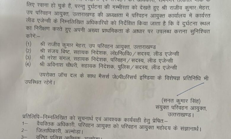 जारी आदेश के अनुसार, संभागीय परिवहन अधिकारी, हल्द्वानी और परिवहन कर अधिकारी, रामनगर मौके पर मौजूद हैं। दुर्घटना की गम्भीरता को देखते हुए उप परिवहन आयुक्त, राजीव कुमार मेहरा की अध्यक्षता में परिवहन आयुक्त कार्यालय में काम कर रही लीड एजेन्सी की टीम गठित की गई है। साथ ही इन सभी अधिकारियों को निर्देश दिए गए हैं कि ये टीम दुर्घटनास्थल का निरीक्षण करते हुए अपनी प्राथमिक रिपोर्ट, परिवहन मुख्यालय को सौंपे। उप परिवहन आयुक्त, राजीव कुमार मेहरा की अध्यक्षता में गठित इस टीम में पीडब्ल्यूडी के सहायक निदेशक संजय बिष्ट, परिवहन के सहायक निदेशक नरेश संगल, पुलिस के सहायक निदेशक अविनाश चौधरी शामिल हैं। इसके अलावा जांच टीम के साथ जेपी रिसर्च इण्डिया के विशेषज्ञ प्रतिनिधि भी मौजूद रहेंगें।