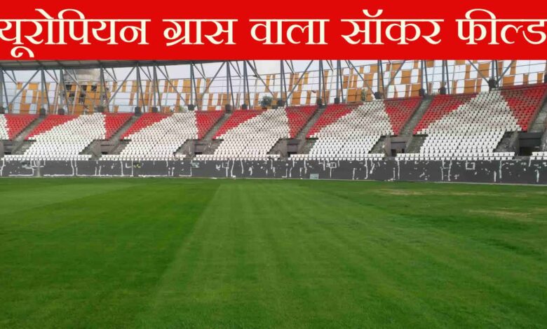 हल्द्वानी इंटरनेशनल स्टेडियम में यूरोपियन ग्रास का फुटबॉल मैदान तैयार