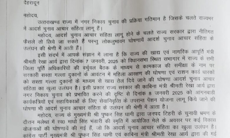 उत्तराखंड कांग्रेस के प्रदेश अध्यक्ष करन माहरा की ओर से पार्टी के प्रदेश प्रवक्ता शीशपाल बिष्ट ने राज्य निर्वाचन आयुक्त से मिलकर धामी सरकार के मंत्रियों पर लगातार आचार संहिता उल्लंघन किए जाने का मुद्दा उठाया। करन माहरा का आरोप है कि जिस दिन से निकाय चुनाव की आदर्श आचार संहिता लागू हुई है, उसी दिन से सभी राजनीतिक दलों के लिए आचार संहिता के नियमों का पालन करना अनिवार्य हो गया है। लेकिन प्रदेश की भाजपा के लिए कोई नियम कायदे नहीं है।
