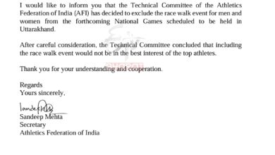 इंडियन ऐथलीट फैडरेशन ने रेस वॉक इवेंट को कैंसिल कर दिया गया खेल में सबसे अधिक ओलंपिक खिलाड़ी है प्रदेश…