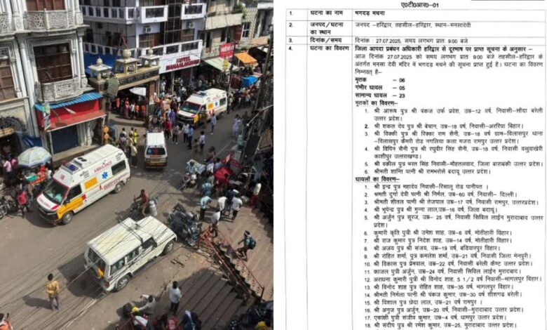 जानकारी के मुताबिक हरिद्वार मनसा देवी मंदिर भगदड़ हादसे में 6 लोगों की मौत हुई है। 5 लोग इस हादसे में गंभीर रूप से घायल हैं। 23 लोग सामान्य घायल है। 6 लोगों की घटना में मौत हुई हैं।