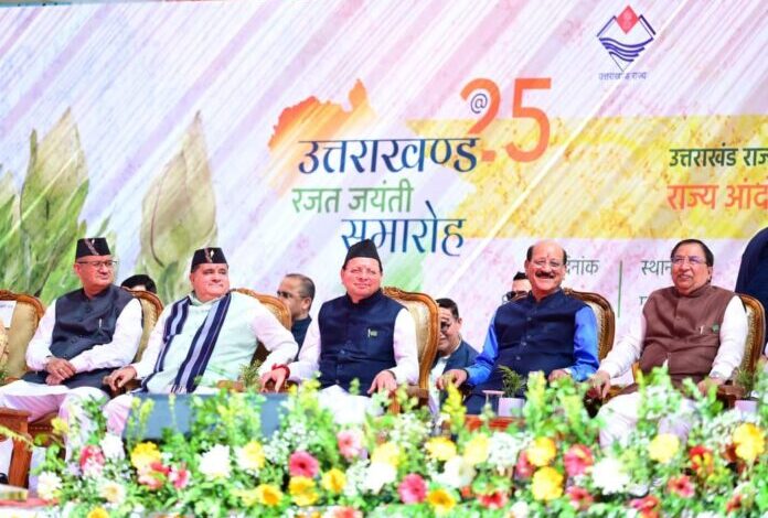 देहरादून। मुख्यमंत्री पुष्कर सिंह धामी ने शनिवार को देहरादून स्थित शहीद स्थल कचहरी परिसर में उत्तराखंड राज्य आंदोलनकारी शहीदों को पुष्पांजलि अर्पित कर उन्हें श्रद्धांजलि दी। इसी क्रम मेंउत्तराखंड राज्य स्थापना के रजत जयंती वर्ष के अवसर पर मुख्यमंत्री ने पुलिस लाइन में आयोजित राज्य आंदोलनकारी सम्मान समारोह में राज्य आंदोलनकारियों और शहीद राज्य आंदोलनकारियों के परिवारजनों को सम्मानित किया। कचहरी परिसर शहीद स्थल और पुलिस लाइन देहरादून में इस अवसर पर राज्य आंदोलनकारियों पर हेलीकॉप्टर से पुष्प वर्षा भी की गई।